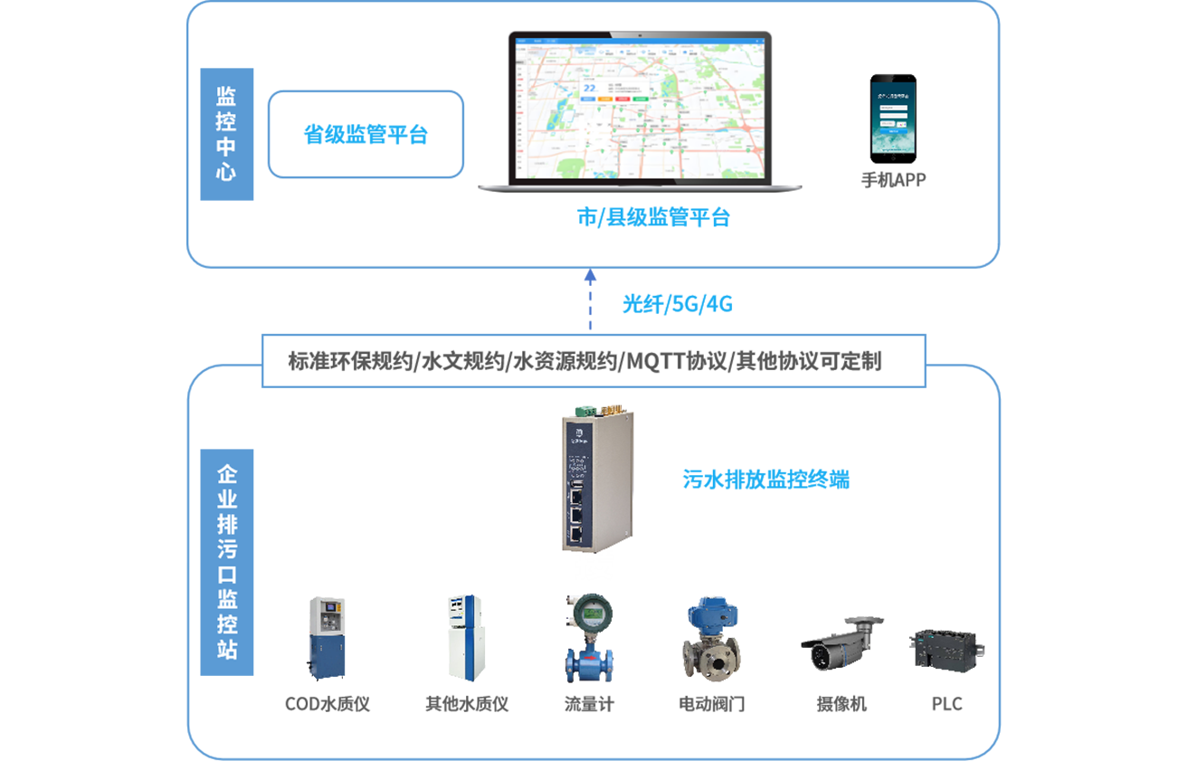 在企业污水排放口安装各类水质监测仪器(如化学需氧量分析仪、氨氮测定仪、重金属检测仪等)和流量计,顺利获得K8凯发天生赢家一触即发的工业智能网关将采集到的污水排放数据(包括流量、水质指标等)实时传输至污水排放监测平台。平台对数据进行实时分析和存储,当水质超标时立即发出预警,并将相关信息发送给环保监管部门。同时,平台具备数据统计分析功能,可生成排放报告,支持远程监管执法和企业的合规管理。