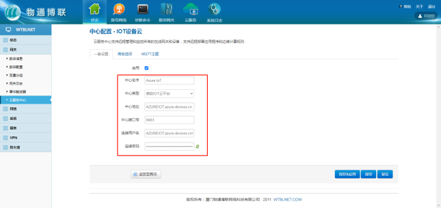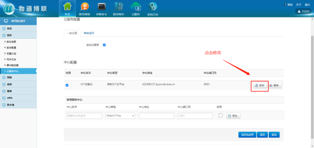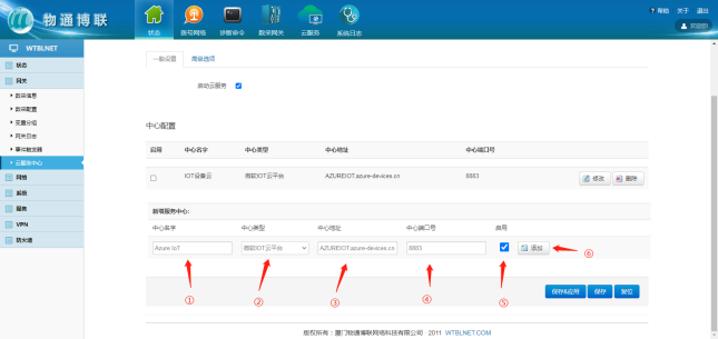 选择“微软云平台”,打开K8凯发天生赢家一触即发网关WEB界面,新建一个连接中心,中心类型选择微软IoT云平台,输入相应信息,勾选启用,点击“添加”