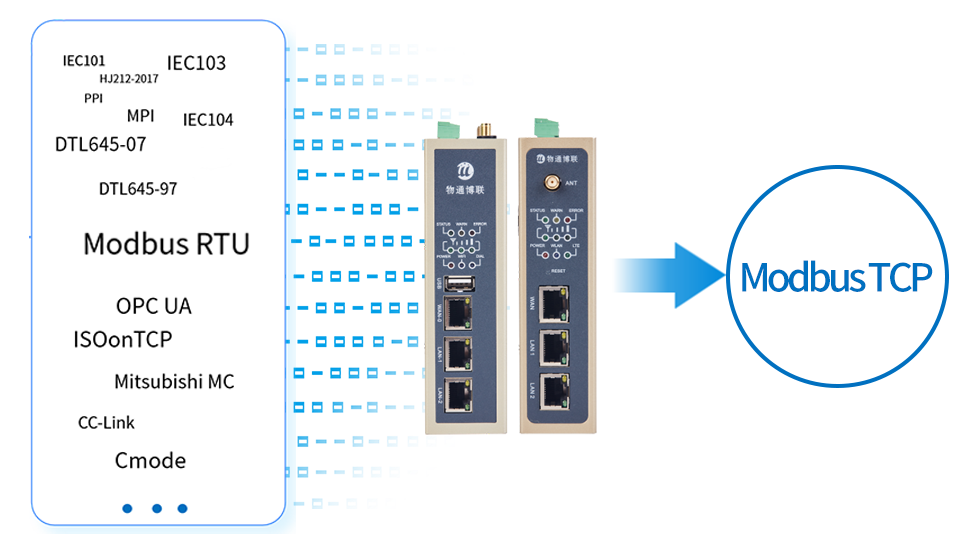 支持实现PLC/DTL645/IEC101/IEC104/IEC103等协议转Modbus TCP