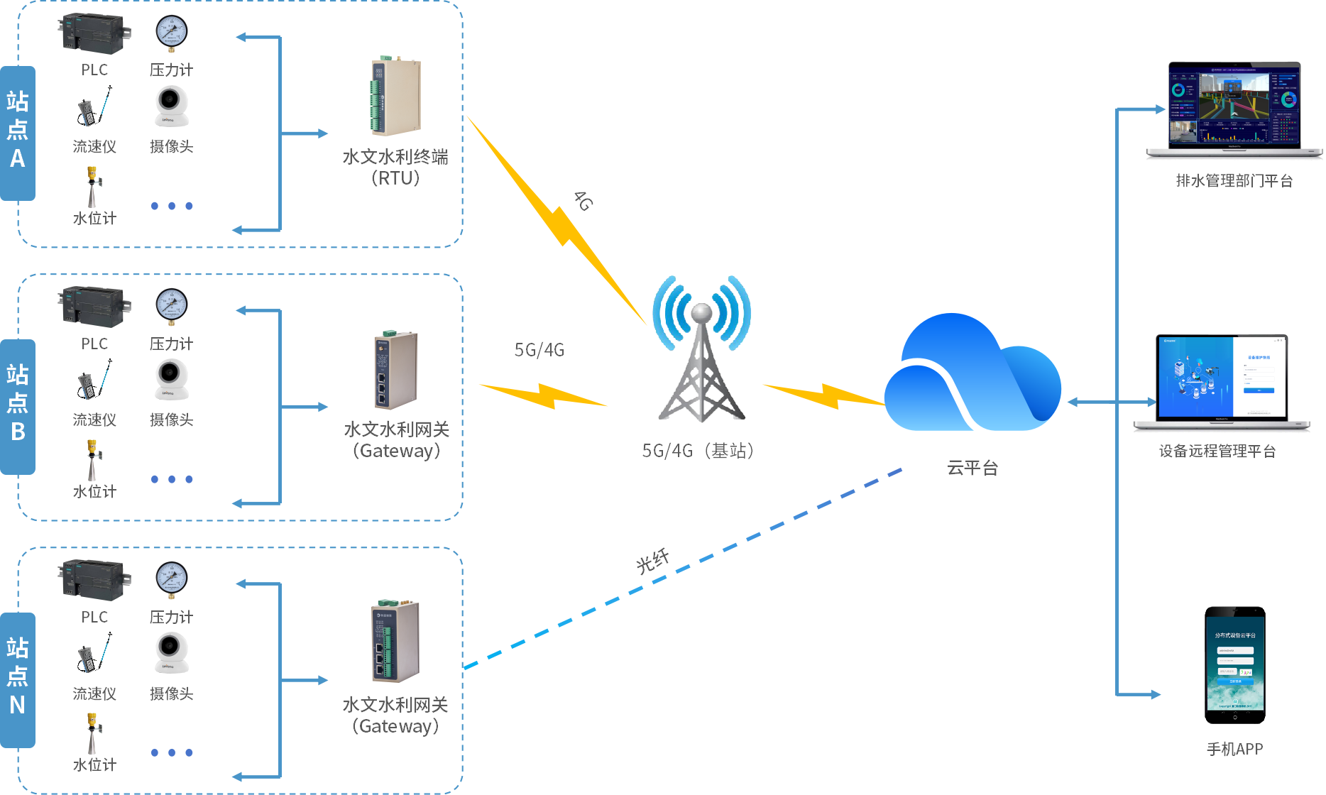 城市排水管口以及关键交汇口部署监测站(水位计、流量计、流速仪、压力计等),接入K8凯发天生赢家一触即发水文水利网关(RTU),实时采集水位、流量、流速、水压等数据并顺利获得5G/4G或光纤网络远程传送至排水管理部门平台,实现远程监控、超限告警、设备定位等功能,管理人员可以随时分析城区各区域排水管网运行状态并解决漏损问题,既满足排水管网日差巡查的管理需求,也能确保暴雨汛期时排水管网的正常运行性能,为预防城市内涝做出可靠贡献。