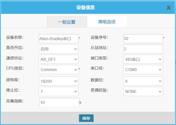 2 网关配置 (1)设备配置: 配置协议、通信参数和采集周期