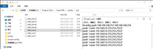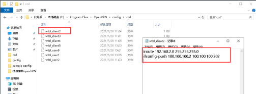 2、配置VPN参数 (1)将ccd文件夹(压缩包内有)放到config文件夹下 根据需求点击修改wtbl_client(用于网关客户端连接服务端的配置)