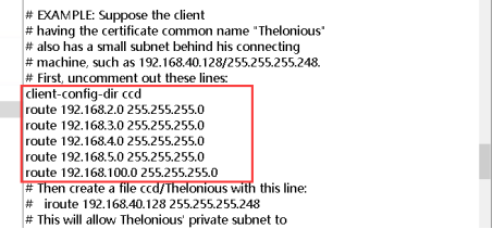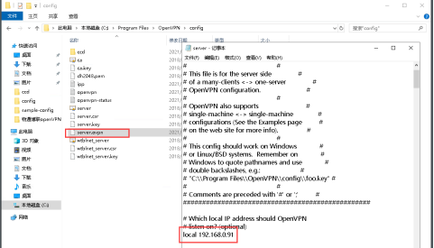 push "route 192.168.2.0 255.255.255.0" :可以访问2网段的地址 将服务端文件夹(压缩包内有)拷贝到config文件夹下 修改server.ovpn