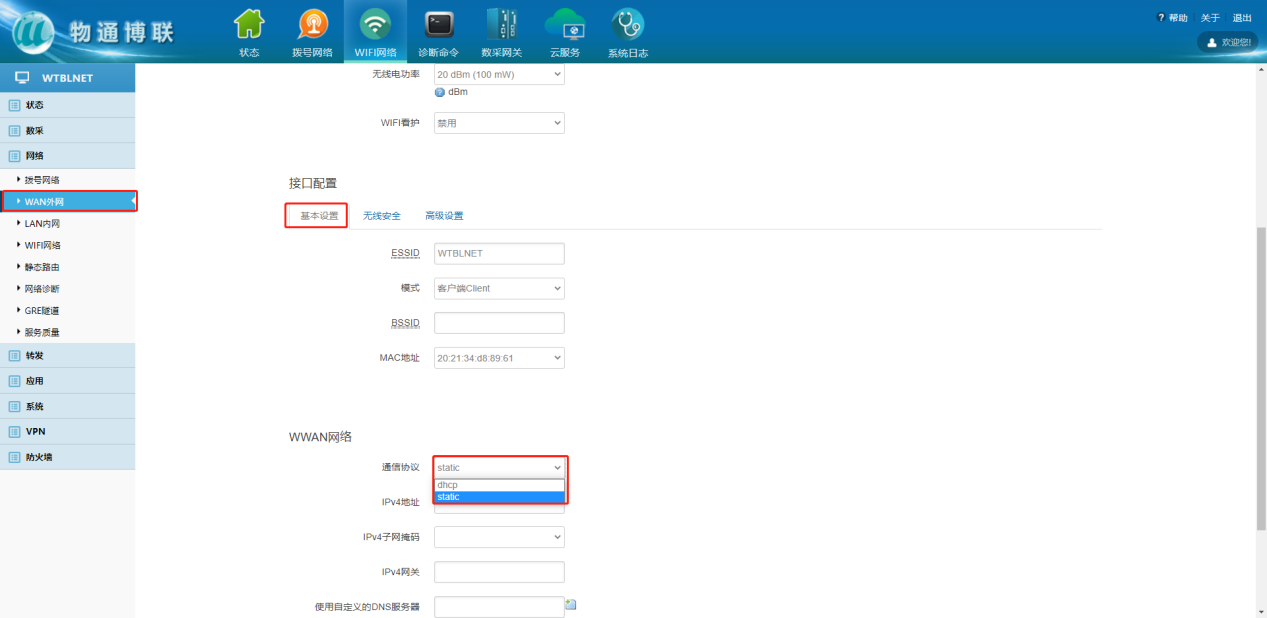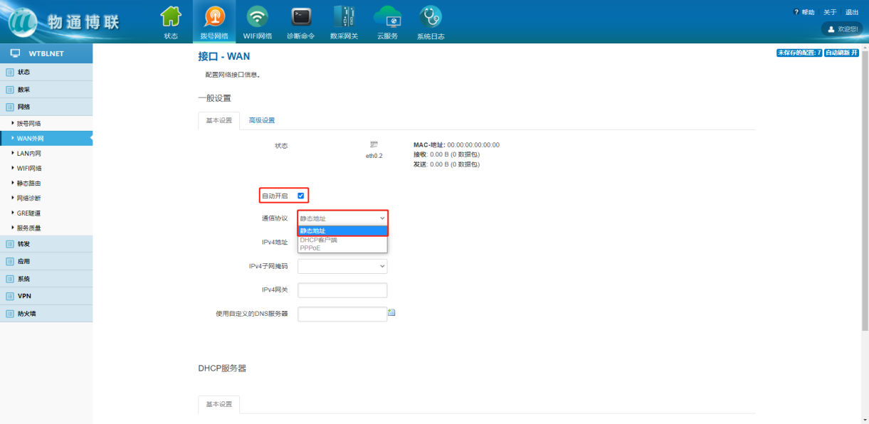 网络—WAN外网—切换通信协议——填写固定IP参数