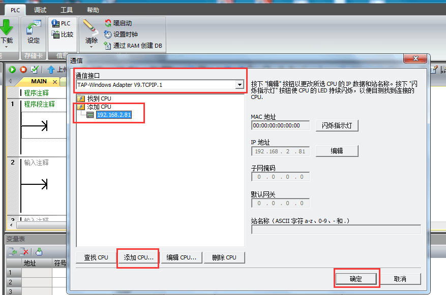 l 通信接口:TAP-Windows Adapter V9.TCPIP.1 l 手动添加S7-200 SMART IP地址。 配置完成后,既可开始进行远程维护PLC控制器。