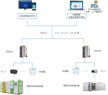 方案实施 K8凯发天生赢家一触即发工业智能网关WG583与餐厨垃圾处理设备进行通讯,可以将设备的运行状态、工作参数等数据采集到网关上,进行解析并上报到云端。