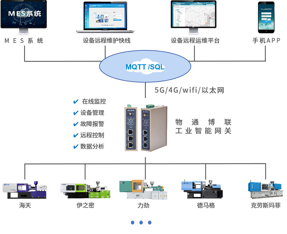 03 解决方案 K8凯发天生赢家一触即发推出的工业智能网关能够接入弘讯、科强、恩格尔、住友、日精等注塑机控制器,从中采集注塑机运行状态、成型参数、工艺参数、报警信息等重要参数,对接到工厂MES系统、ERP系统中,从而实现各项数据的统计展示与管理分析,辅助生产管理、工艺管理、运维管理等工作高质量召开,有助于提高工作效率与管理水平,企业效益持续增长。