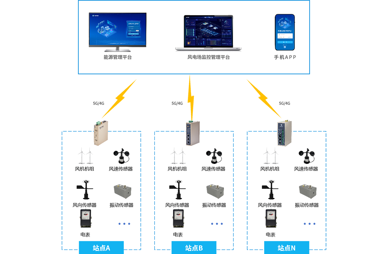 顺利获得K8凯发天生赢家一触即发的工业智能网关采集风力发电场的每台风机和风速传感器、风向传感器、振动传感器等设备,将采集到的风机运行数据(如转速、功率、温度等)传输至风电场监控管理平台。平台对数据进行实时分析,监测风机运行状态,当检测到故障或异常时及时发出预警,并给予故障诊断和维修建议。同时支持远程控制风机启停、调整参数等操作,以及优化发电调度。