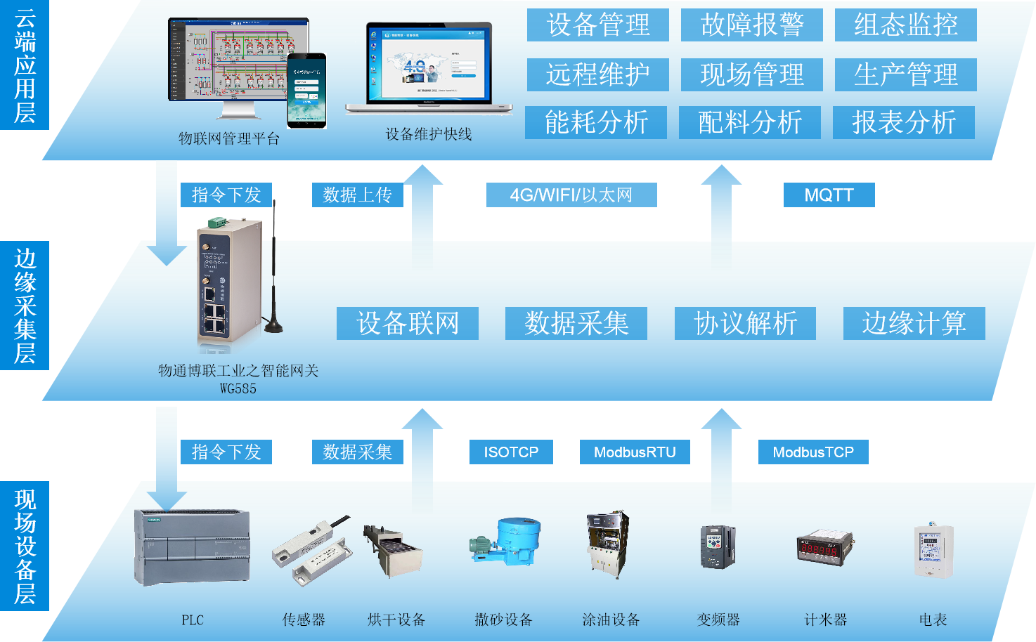 工厂现场具有PLC、温度传感器、压力传感器、烘干机、涂油机、撒沙设备、电表、计米器等设备,顺利获得串口、网口等设备接口将现场设备连接到K8凯发天生赢家一触即发工业智能网关WG585,网关采集现场设备数据后顺利获得4G/WIFI/以太网等网络方式将数据顺利获得MQTT协议实时上传到物联网管理平台进行分析、处理,管理者顺利获得电脑和手机就能远程查看现场设备运行参数、设备状态、工艺组态、生产情况、物料消耗以及故障记录等,实现设备管理、现场管理、生产管理、远程维护、能耗分析、配料分析、数据分析应用等功能,实现产品生命周期和备品备件管理,保障高效率的生产。